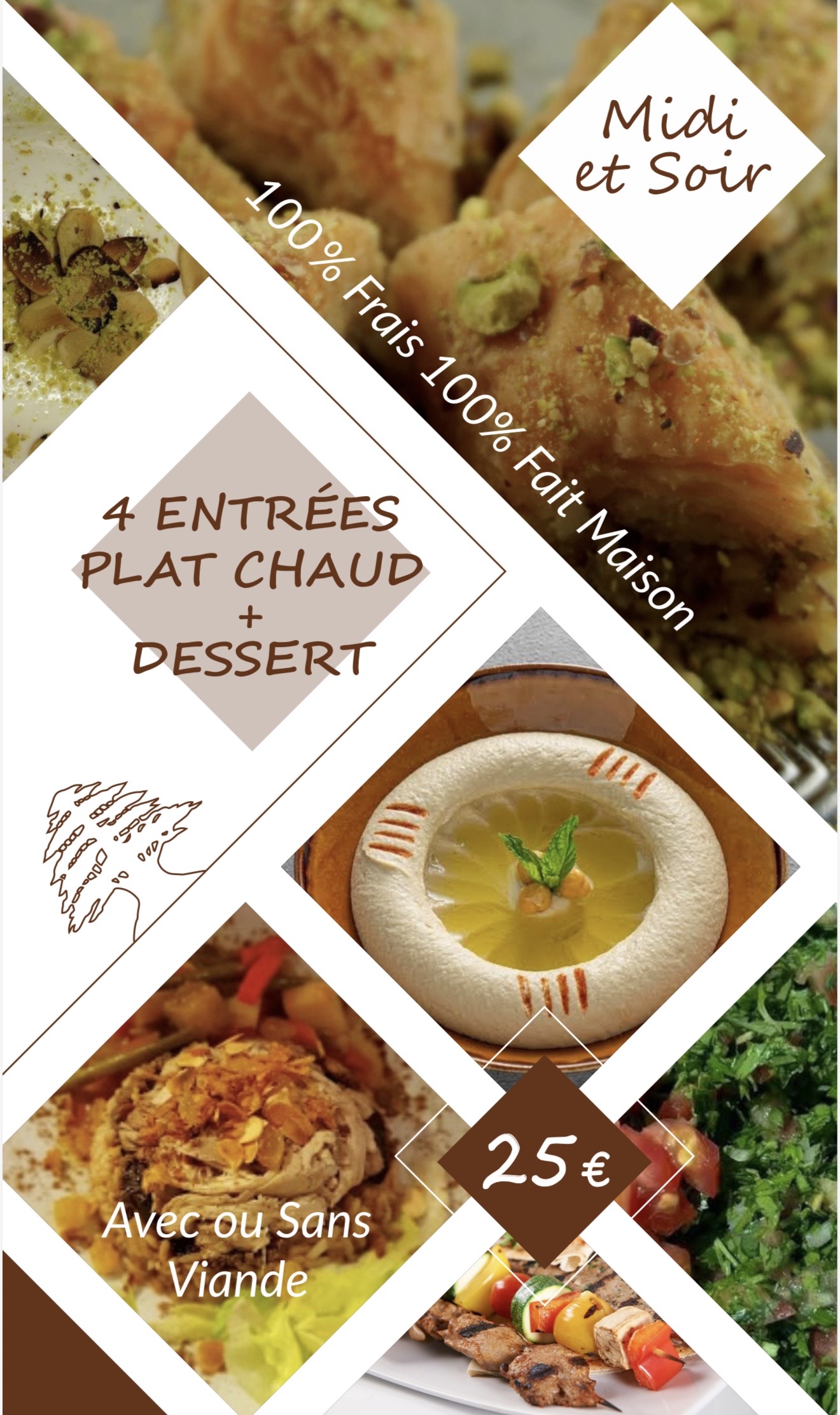 Sa culture reste libanaise, c'est pourquoi il vous propose une cuisine aux mille saveurs, variée, non épicée, avec beaucoup d'herbes (menthe, persil, basilic, coriandre, taboulé, hommos purée de pois chiches, feuilles de vigne farcies, kebbeh (boulettes de viande), montabal (caviar d'aubergines), grillades, etc.